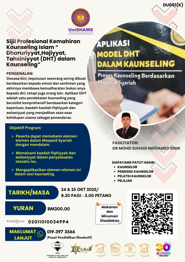 Sijil Profesional: Kemahiran Kaunseling Islam "Dharuriyyat, Hajiyyat, Tahsiniyyat (DHT) dalam Kaunseling"